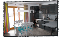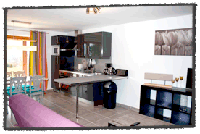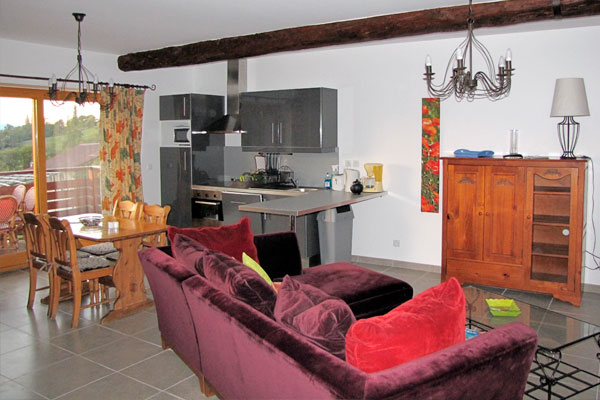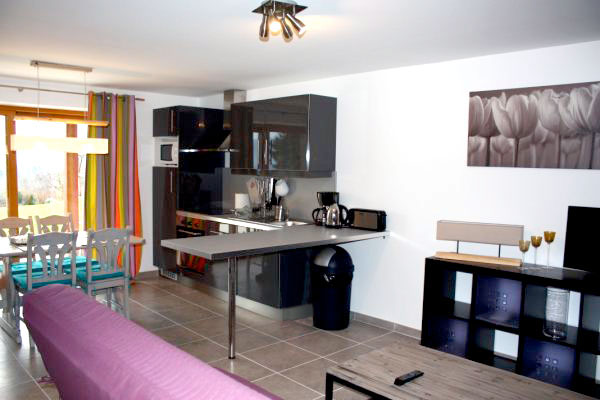 Séjour avec TV, cuisine ouverte et équipée toutes commodités